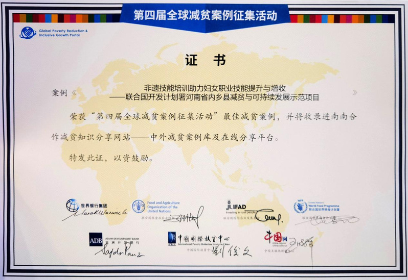 2023年11月1日,由中国国际扶贫中心、国际农业发展基金、联合国粮食及农业组织、联合国世界粮食计划署等7家单位联合主办的“2023 全球减贫伙伴研讨会”在北京会议中心举行。研讨会上公布了第四届“全球减贫案例征集活动”最佳案例。我校百合小说 、非遗研究中心组织实施的《非遗技能培训助力妇女职业技能提升与增收——联合国开发计划署河南省内乡县减贫与可持续发展示范项目》入选最佳减贫案例,并收录南南合作减贫知识分享网站——中外减贫案例库及在线分享平台。