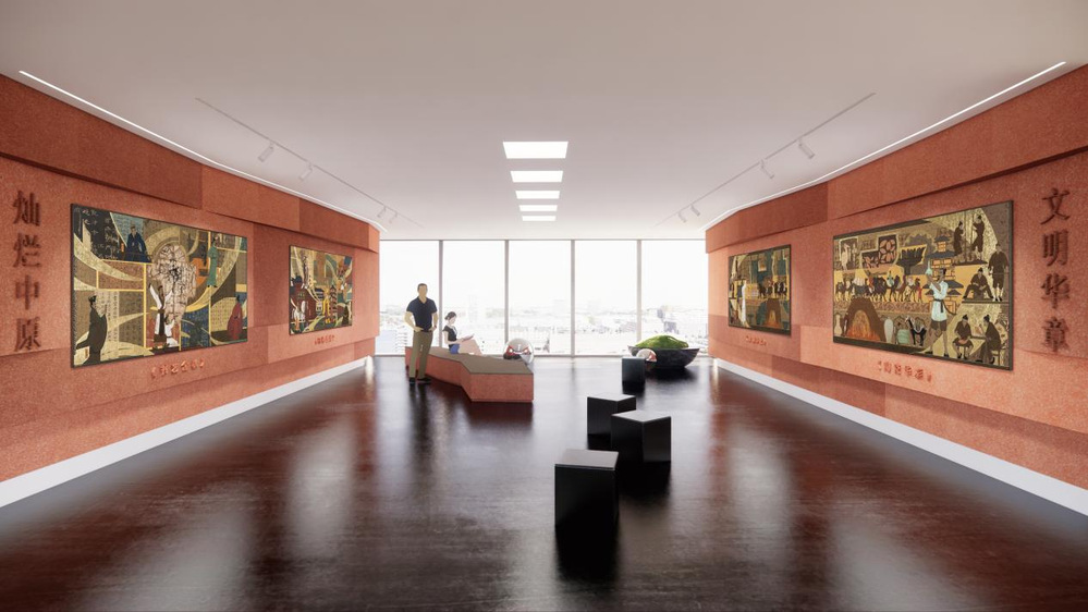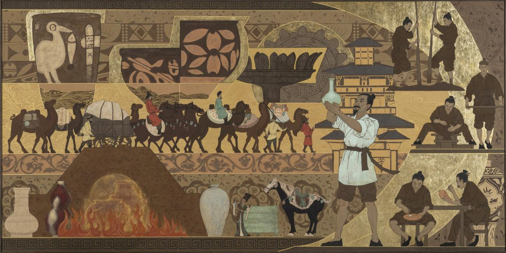 《灿烂中原 文明华章-陶瓷华彩》 126×256CM 重彩壁画 2023-2024年