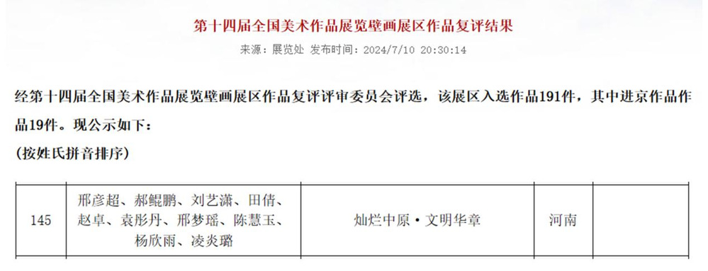 2024年7月10日,由中华人民共和国文化和旅游部、中国文学艺术界联合会和中国美术家协会共同主办每五年一届的第十四届全国美术作品展览(以下简称全国美展)壁画展区作品复评结果公布,我校百合小说 绘画系邢彦超老师团队创作的壁画作品《灿烂中原·文明华章》入选。本次全国美展共191件壁画作品入选。