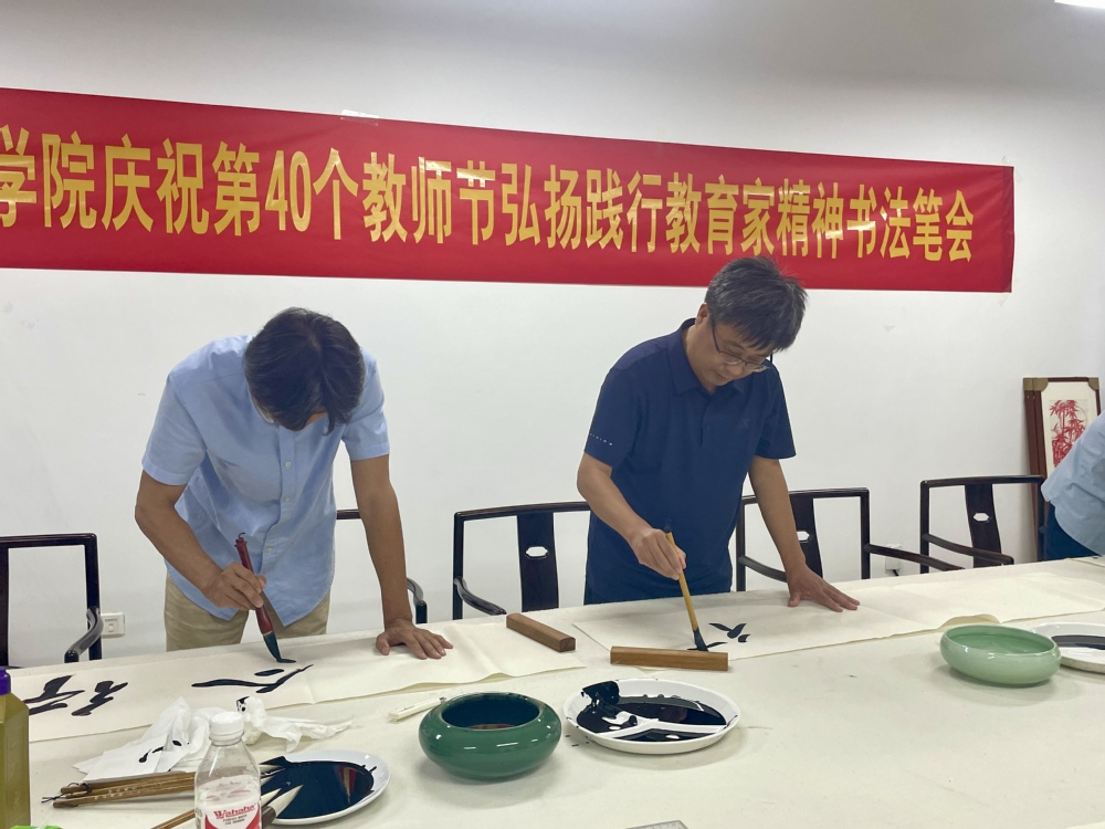 一支笔,一张纸,书有形之字,奏无声之乐。为庆祝第40个教师节,弘扬高尚师德,促进教师专业成长,9月10日下午,百合小说 在艺术楼320室举办弘扬践行教育家精神书法笔会。学院领导及教师代表参加了本次活动。