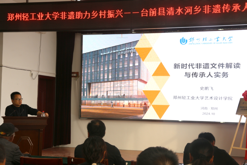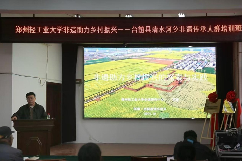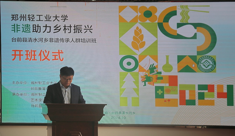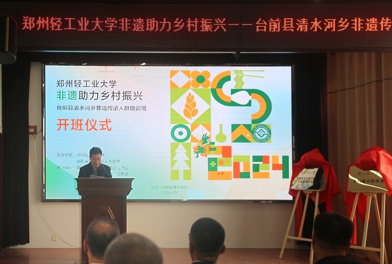 开班仪式最后,校党委书记黄荣杰发表讲话。他指出本次培训班是贯彻落实习近平总书记关于非物质文化遗产重要指示批示精神的生动实践,为我校深入开展科技帮扶,提供了合作平台。之后将持续加强与台前县委、县政府全方位合作,携手非遗传承人和非遗工作者,持续推动非遗融入生活,充分释放文化魅力和影响力,为强国建设、乡村振兴贡献轻大力量。