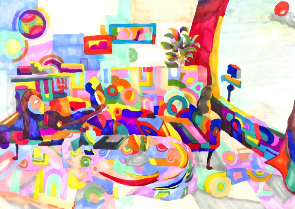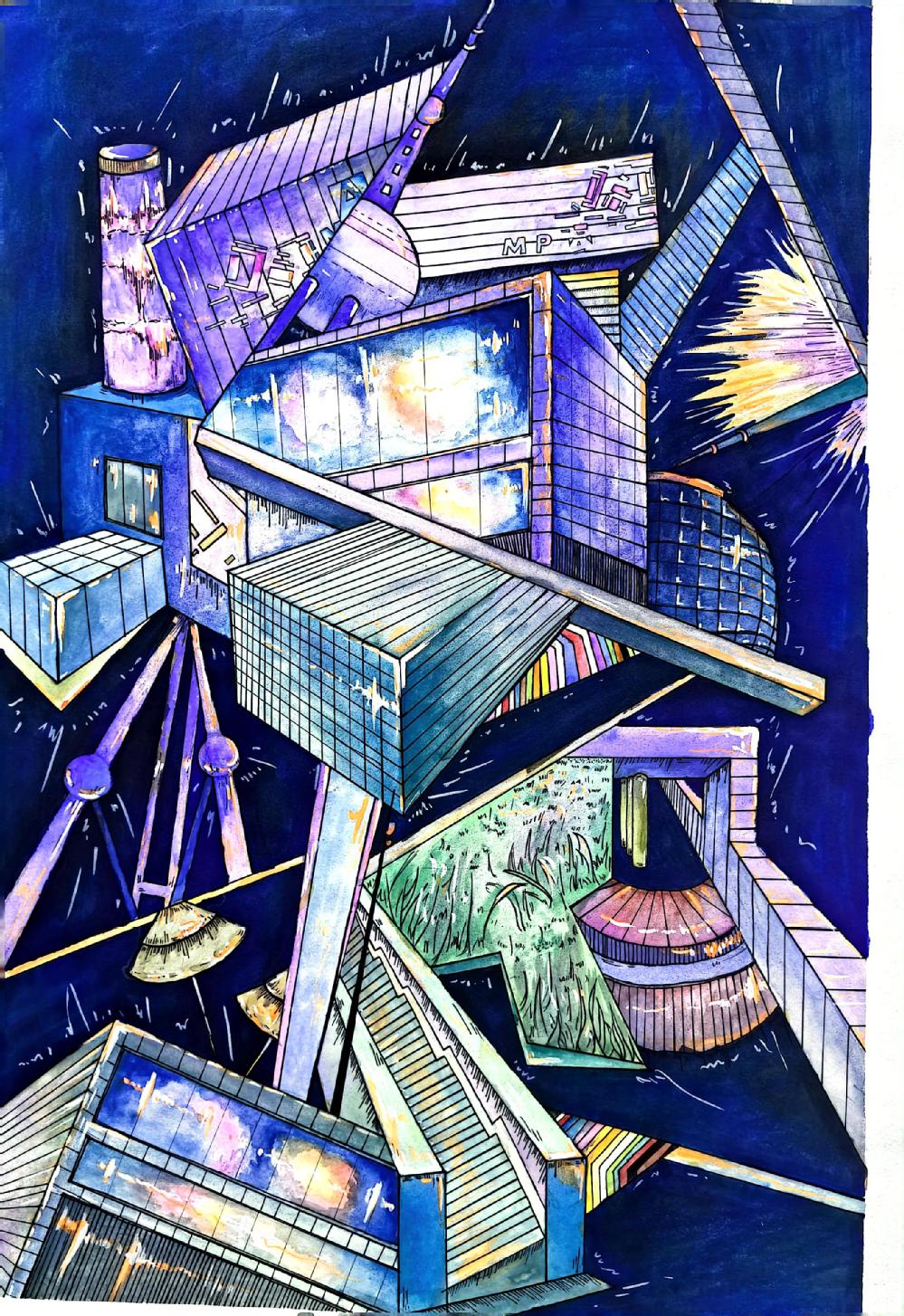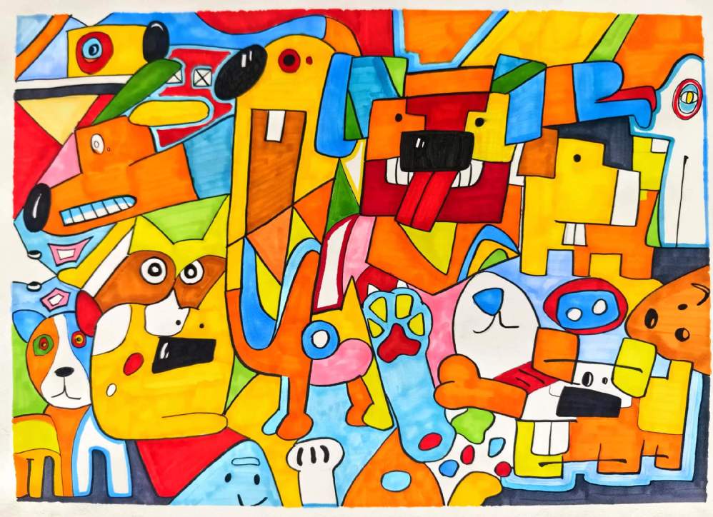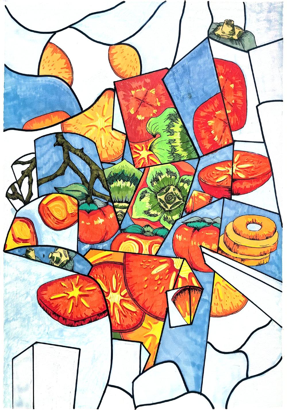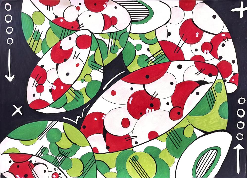 要求:以“情绪+?”为题进行创作,通过“+?”这种载体(载体可以延续第一部分你所选择的事物,也可以自由选择),来表达一种情绪或气氛,运用抽象与概括的相关知识,彩色表现。
