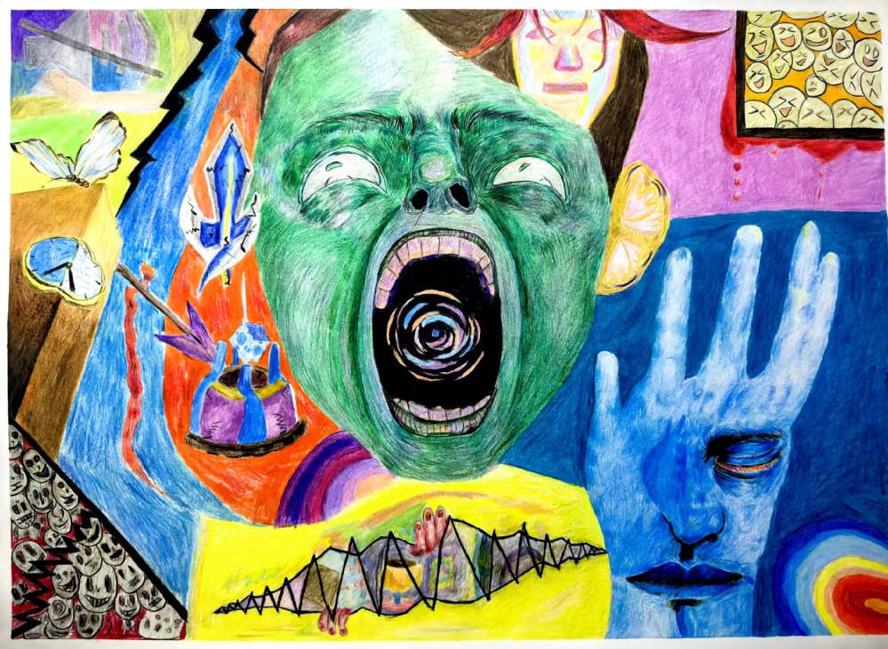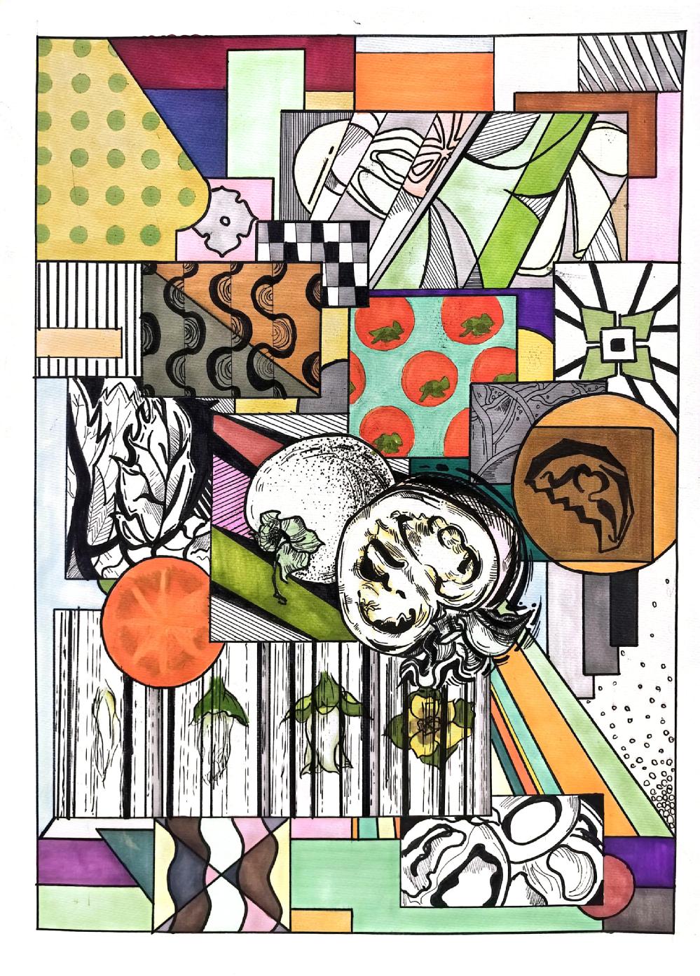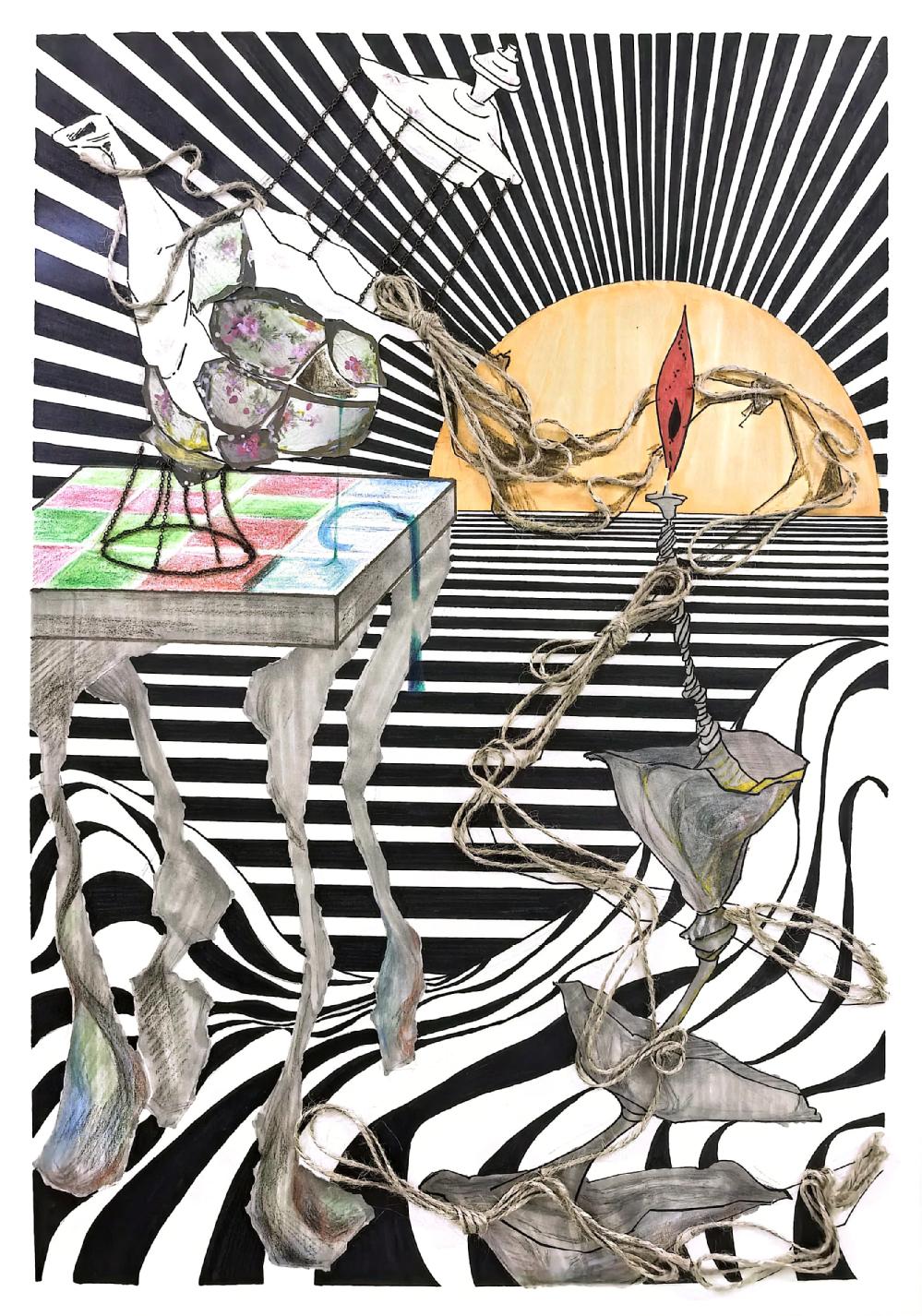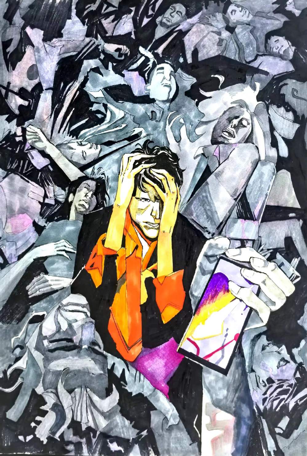 要求:以“情绪+?”为题进行创作,通过“+?”这种载体(载体可以延续第一部分你所选择的事物,也可以自由选择),来表达一种情绪或气氛,运用抽象与概括的相关知识,彩色表现。