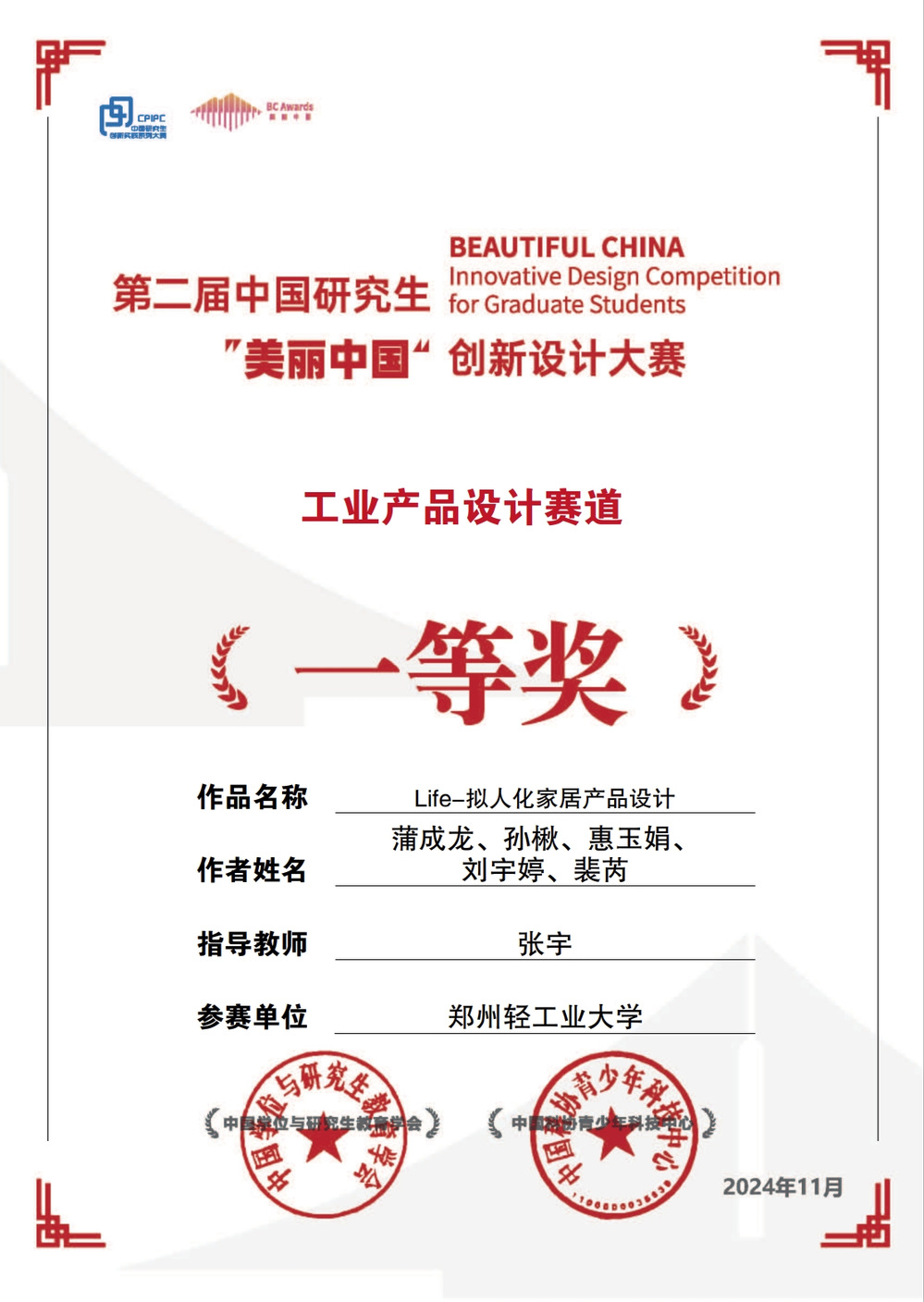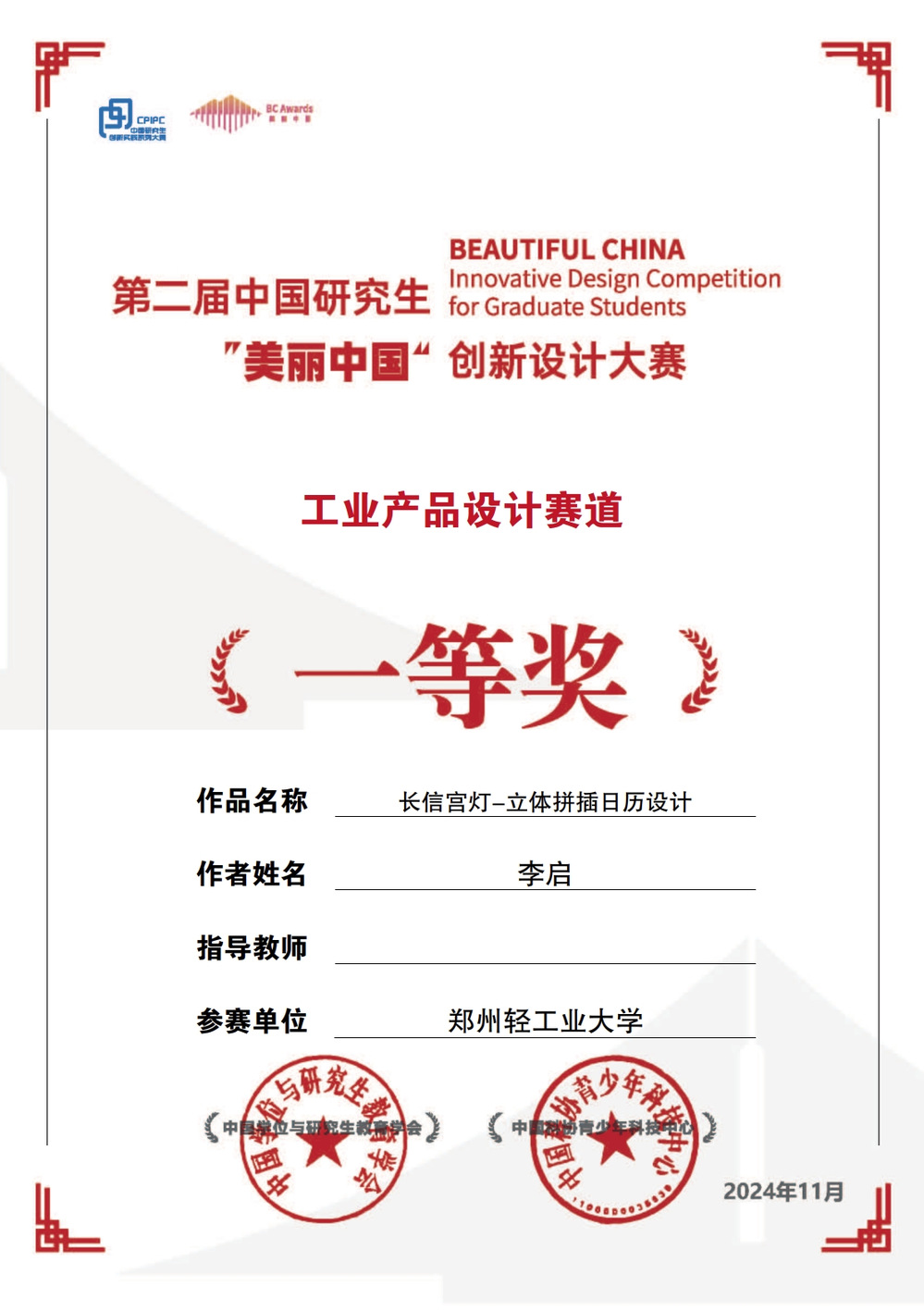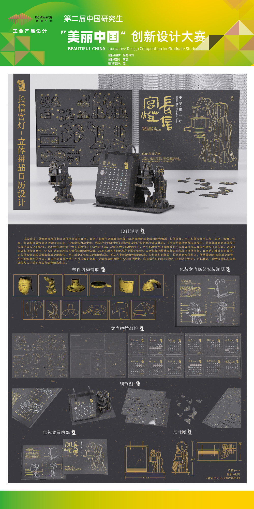 本次大赛工业产品设计赛道决赛在江南大学设计学院举行,共吸引来了来自中国美术学院、浙江大学、湖南大学等全国206所研究生培养单位1584支团队,共计4420名研究生报名参赛。经两轮线上初评后,共有47所高校100支队伍的作品应邀参加现场决赛路演,最终评选出一等奖30名,二等奖50名。经过激烈角逐,百合小说 工业设计专业研究生李启同学的《长信宫灯-立体拼插日历设计》;蒲成龙、孙楸、惠玉娟、刘宇婷、裴芮同学的《Life-拟人化家居产品设计》在层层选拔中脱颖而出,双双荣获第二届中国研究生“美丽中国”创新设计大赛工业产品设计赛道决赛一等奖,展现了艺设学子的专业素养和精神风貌。