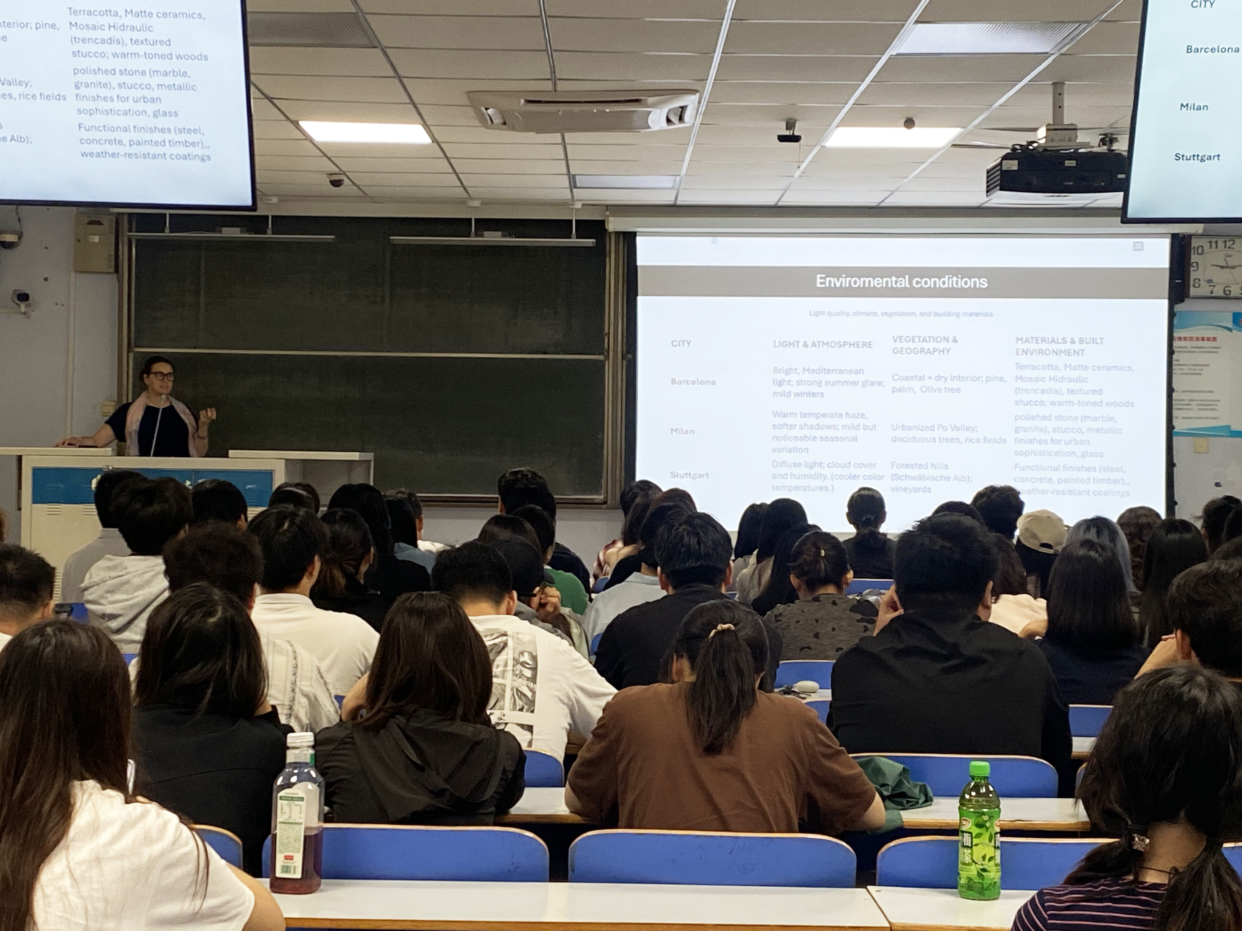 在报告中,Lia教授首先结合自身经历讲解了色彩在不同国家的应用情况。通过对比分析不同国家自然环境中的光照、湿度和景观色彩,指出,地域环境对色彩应用具有深远影响。随后,她从文化象征意义的角度,介绍了色彩背后的故事,并探讨了历史和贸易如何促进色彩在品牌推广中的作用。Lia教授还深入分析了时尚设计中流行色的产生、推广与提取过程,以及国际品牌如何实现色彩的本地化应用。报告的最后,Lia教授对同学们提出的相关问题进行了详细解答,现场互动热烈。
