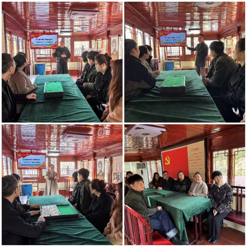 研学活动以“追溯红色根脉,传承革命精神”为主题,首站来到情景园内的核心场景——嘉兴南湖红船复原景观。红船作为中国共产党诞生的象征,承载着开天辟地、敢为人先的伟大精神。在红船里,李金梅副书记与学院党委委员、副院长卢建洲教授,北京印刷学院设计艺术学院设计学教师党支部书记刘秀伟教授共同登台,为在场师生讲授了一堂别开生面的微党课。