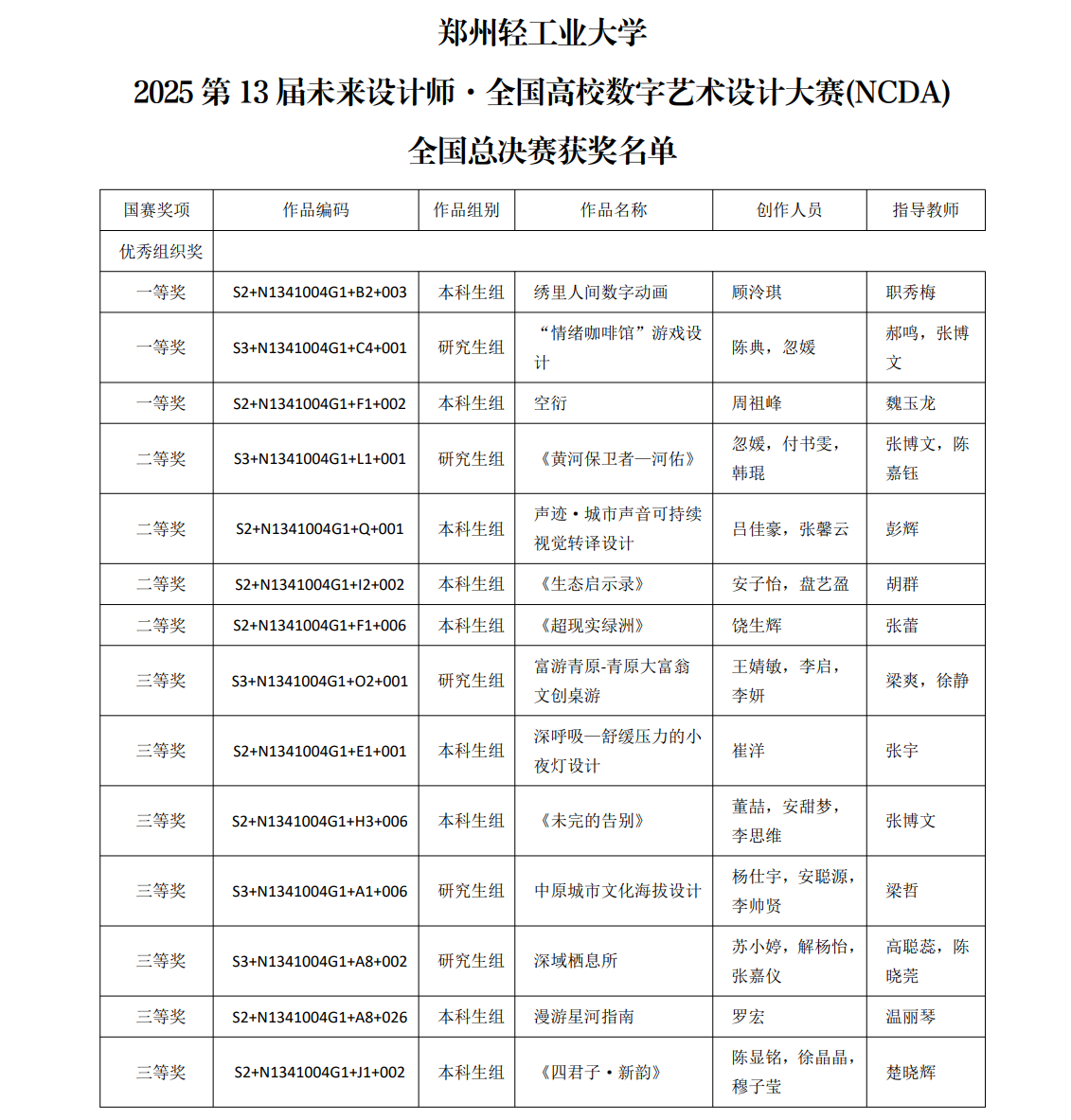 未来设计师·全国高校数字艺术设计大赛(NCDA)是由工业和信息化部人才交流中心主办,已有13年的历史,入选《全国普通高校大学生竞赛排行榜》,并获得“学习强国”学习平台和联合国机构的支持。本届大赛全国共有1,893所高校参与,征集作品29万余件,设有29个省级赛区。参赛作品经过校级赛、资格赛、省级初赛、省级决赛以及全国总决赛等多轮激烈角逐,最终评选出全国赛的一、二、三等奖及优秀奖,竞争激烈。